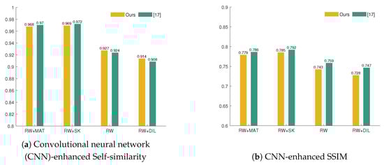 Hence, drawing from the insights of [37,38], we validate our method with three metrics that measure the similarity between features maps that were extracted with the pretrained AlexNet for the ground-truth and inpainted images; Self-Similarity based on Pyramid Histogram of Oriented Gradients [37], CNN-enhanced PSNR, and CNN-enhanced SSIM [38]. Figure 13 displays the global performance of these metrics (pooled from the intermediate results at each convolutional layer). Based on CNN-enhanced PHOG self-similarity (Figure 13a), our method slightly outperforms [17] for bigger areas of damage (RW, RW+DIL). However, the overall values of CNN-enhanced PSNR and SSIM for [17] are better than ours. Nonetheless, we continue the analysis by exploring the internal representations of these metrics and study their performance for each convolutional layer. In this sense, one important finding of [37,38] is the proportionality between the order of the convolutional layer and the correlation with subjective scores. Thus, the first convolutional layer, because of embedding lower-level features, is farther away from human perception than the fifth convolutional layer that embeds higher-level features. Figure 14b,c show that the CNN-enhanced SSIM and PSNR for convolutional layers 2–5 are better for our method in comparison with [17], even for larger missing content (RW, RW + DIL). We could further infer that what draws back the pooled overall results for our method (Figure 13c and Figure 14b) is explained by the poorer performance of the first convolutional layer only. This suggests that our method preserves more of the mid-level and higher-level features in restoring the original images. It is noteworthy to relate these findings with a study on color responsivity of AlexNet [40], where it is claimed that all layers have color responsivity in a trend that decreases from first convolutional layer to the fourth one and then rises back in the fifth layer. Accordingly, the highest color responsivity is given by the first and last layer. Nonetheless, the first layer deals with a basic encoding of the color signal, while the last layer responds to more complex color encodings. Therefore, we could extrapolate that, based on the higher performance of all CNN-based metrics for the last convolutional layer, our method handles better complex entanglements between spatial and chromatic signals.