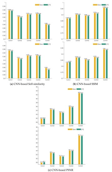 Recent works in the field of image quality evaluation have demonstrated the effectivenes of CNN-based IQMs [37,38,39]. In other words, measuring the similarity in the feature space extracted by convolutional neural networks is in more agreement with the human subjective scores than by directly comparing end-level images. In [37], Amirshahi et al. compute the similarity of feature maps extracted from CNNs (AlexNet and VGG19 networks pretrained on ImageNet dataset). They compute the self-similarity of feature maps at each convolutional layer and at multiple levels of spatial resolution inspired by the Pyramid Histogram of Oriented Gradients (PHOG) approach. The final aggregate metric is given by the geometric mean of the single metrics determined for each convolutional layer. They test their method on four image quality datasets of natural images with various distortions and show that the CNN-based self-similarity measure has more correlation with human subjective scores than PSNR, SSIM, and S-CIELAB metrics. This work is extended in [38], where CNN feature maps are compared with traditional IQMs (such as PSNR and SSIM). Similar to [37], the finding is that the CNN-enhancement of IQMs (computed on CNN feature maps) is significantly more correlated with human perception than their traditional variant (applied on end-level image). In addition, the performance of all the proposed CNN metrics is not affected by changing the CNN network [37,38].