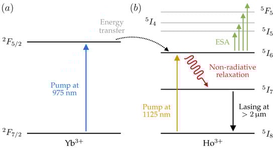 Simplified diagram of the energy levels of (a) Yb3+ and (b) Ho3+ ions, as well as the processes involved to generate lasing beyond 2 μm with pump signals at 975 and 1125 nm