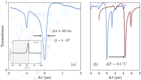 (a) Transmission trace of a typical WGM resonance (inset: radial profile of a fundamental mode of a WGM resonance ( and ); (b) illustrative example of the wavelength shift suffered by the resonances for a temperature increment of C.