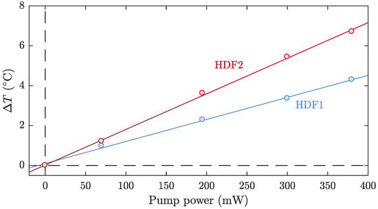 First, we measured the thermal shift of the WGM resonances excited in the HDFs at ∼1 mm after the splice, when the nm pump signal was launched through them. Figure 4 shows the temperature increment in HDF1 and HDF2 as a function of the launched power. The heating rate of HDF1 was C/W, while the rate for HDF2 was C/W. HDF2 suffered a temperature increment ∼1.6 times larger than HDF1. This result is in concordance with the concentration ratio of the dopant used for the fabrication of the fibers, which is HDF2/HDF11.5. As can be observed in Figure 4, in the power range studied, the heating showed a linear trend with the pump power, and there was no sign of saturation or nonlinearity. Exploiting the capability to measure the thermal profile of the fibers, we characterized the temperature increment at different positions along the HDFs. Along a length of mm from the splice between the HDF and the SMF980 fiber used for pump delivery, the heating rate showed the same linear trend, and no significant variations were observed. This allowed us to assume that the pump of the fibers was uniform along the sections of fiber under study, for this length of the resonators/fibers.