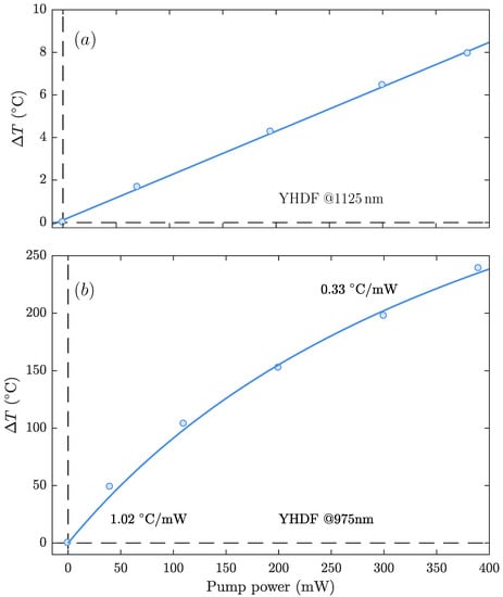 Figure 5a shows the temperature increment of the YHDF as a function of the launched power at nm. The heating rate was C/W, showing a linear trend with no evidence of saturation or nonlinearity in the studied power range. Since the concentration of Ho in the YHDF is similar to that in HDF2, the temperature increments in these two fibers are comparable. Then, the same section of the YHDF was pumped at nm, exploiting the indirect excitation of the multi-system Ho/Yb. Figure 1 and Figure 5b show that the temperature increment experienced by the YHDF was much greater than for the previous scenario. At mW of pump power, the fiber reached a temperature increment that exceeded C.