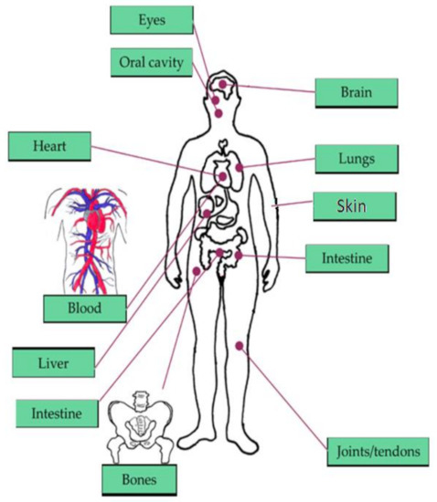 The brain, heart, eyes, intestines, and lungs are the most affected organs in the current living way. The monitoring of human organs like the brain, eyes, heart, intestine, lungs, and vital signs (shown in Figure 1) observation is mandatory for secure and healthy human living to avoid early deaths. According to the year 2019 statistics [1], the death rate caused by heart failure is 647,000 every year, and death is recording for every 37 s as per CDC because of cardiovascular disease. The heart’s major diseases are cardiac arrest, coronary artery disease (CAD), congestive heart failure, aortic disease, peripheral arterial disease, etc. According to a global burden disease study [2] conducted on neurological disorders from 1990 to 2017, around 100 million Americans are being affected by one or more neurological disorders. Among them, Alzheimer’s, Parkinson’s, migraine, and stroke are the foremost neurological disorders leading to death. The average death rate of Alzheimer’s disease is 258,600 deaths, Parkinson’s disease is 30,000 deaths, and stroke is 172,000 deaths. According to Leukemia & Lymphoma Society [3], a death is recording due to blood cancer for every nine minutes, six deaths are recording for every hour, 156 deaths are recording for every day, and the estimated death rate in the United States would be 56,840 by the end of 2020 due to leukemia, lymphoma, and myeloma which are the major blood disorders. In addition, diabetes [4] is becoming the seventh major cause of death in the United States by recording 270,702 deaths in 2017. By the year 2040 [5], an estimation of 78.4 million people over the age introduction of 18 years or older will affect by arthritis, of which two-thirds of them would be women. For every five Americans, one person is developing skin cancers during their lifetime, leading to an estimation of 9500 every day [6]. The major skin cancers are melanoma, non-melanoma skin cancer, basal cell carcinoma, and squamous cell carcinoma, affecting 3 million people every year. By the year 2020, 6850 deaths are recorded due to melanoma skin cancer. By 2050 [7], it is estimated that 8.96 million people will become either visually impaired or blind as per CDC. The national institute of occupational safety and health report says 2000 USA workers are prone to eye accidents every day. According to CDC [8], 14.8 million adults are diagnosed with cancers, in which 266,000 people are diagnosed with gastro intestine (GI) cancers, and 14,400 deaths are recorded due to GI cancers in 2014.