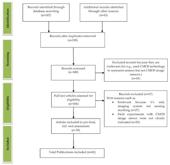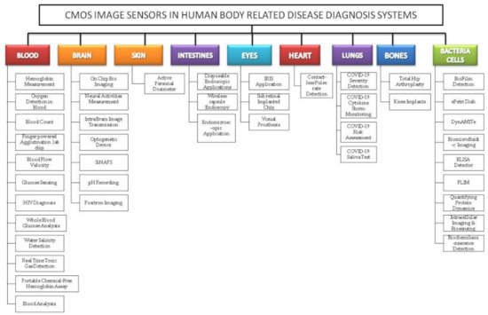 We reviewed the literature covering the years between 2009 and 2021 that is drawn from the article search engines like “Google Scholar”, “IEEE Xplore”, “SpringerLink”, “MDPI”, “Pub Med”, “ELSEVIER”, “ARXIV”, “Scopus”, “Science citation index (SCI)”, “SPIE Digital Library”, “ACM Digital Library”, “ASME.” The review was conducted systematically by a PRISMA workflow, as shown in Figure 2. Different tools were available for searching and selection of publications like “DOAJ,” “EndNote,” and “Microsoft Excel.” We included the publications involving CMOS image sensors used in medical applications to monitor different body parts like the brain, bones, eyes, blood, intestine, heart, and lungs. We classified the searched publications into qualitative, quantitative, book, and editorial categories. The entire search was conducted based upon the words used in the “keyword” section. We searched and collected articles of about 190 papers, and finally, we bound the selection to 42 full-text articles from the year 2009 to the year 2021. All the 42 papers are cited in the reference section, and “EndNote” software was used for managing the references. As our literature survey is conducted on CMOS image sensors in the medical field, we primarily focused on the articles from “Elsevier” and “Google Scholar.” We excluded the articles that are not in English, particularly those irrelevant since the imaging systems used were not sensing anything. Some articles are also excluded because they did not mention the usage of CIS in their field experiments. The other articles excluded are duplicate articles, unreachable articles. The entire flowchart for the selection process, including identification, screening, eligibility, and inclusion, is shown in Figure 2 [10]. Based on the study selection methodology using PRISMA workflow, we have classified our literature survey according to vital signs and organs of the human body-related disease diagnosis systems embedded with CMOS image sensors, as shown in Figure 3.