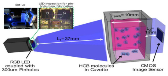 Quantifying hemoglobin concentration is an essential process in most clinical laboratories to analyze the postoperative bleeding, status of autologous blood transfusion, anemia, etc. Over 400 million hemoglobin tests for concentration are conducted every year to identify blood-related diseases and disorders in the United States. Dong-Sik Kim et al. [11] developed a new technique to make hemoglobin concentration measurement cost effective and straightforwardly. It provides accurate hemoglobin values from samples of blood without involving any reagents harmful to the environment and works with the help of LED and CIS as shown in Figure 4.