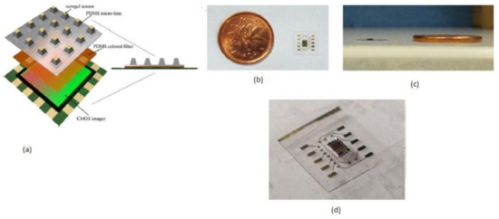 Mini chemical sensors play a crucial role in medical applications like patient bed monitoring and disposal sample answer systems, personal safety, and implantable chips. Daisy S. Daivasagaya et al. [12] focused on luminescence sensors microarrays, which provide more advantages like a fast response, no additional reagents required, and will not spoil the sample media. He described a portable optical gaseous oxygen sensor microsystem using xerogel sensor elements, contact printed on the top of a trapezoidal lens like microstructures molded into polydimethylsiloxane (PDMS). PDMS is a soft, biocompatible, flexible, and an optically transparent silicon-organic polymer suitable to fabricate the lens, diffusers, and filters of the optical sensors. The imaging sensor system’s block diagram is shown in Figure 5.