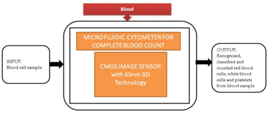 Generally, in old-aged people, a complete blood count (CBC) is one of the resources for blood tests to find the health status of patients with heart diseases. Most of the CBC instruments like hematology analyzers and hemocytometers are implemented traditionally. These instruments need heavy equipment like some actuators, countertop, and liquid systems. So, these instruments are limited to laboratories in hospitals and research centers. An alternative solution to calculate CBC is using Raman scattering and optical microscopy. Xu Liu et al. [13] developed a super-resolution microfluidic cytometer to perform CBC tests. The microfluidic cytometer prototype consists of a PDMS microfluidic channel with attached CIS, PCB (printed circuit board) incorporated in FPGA board, and a MATLAB GUI working laptop shown in the paper. Its black-box approach is shown in Figure 6. This lens-free microfluidic cytometer is well suited for high accuracy whole blood recognition and its count in the point-of-care diagnosis of old-aged people.