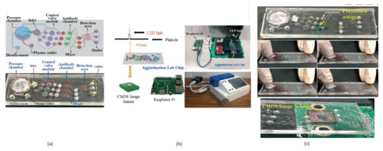 The term agglutination is an antigen and antibody reaction, which will happen during the clumping of visible particles formation. In this process, antibody combines with the respective antigen with the electrolytes at a specific pH and temperature. Chung Hsiang Lu et al. [14] developed a finger-powered agglutination lab chip with a CMOS image sensor outside that was affordable and cost-effective. For demonstration, blood grouping is used to verify the function of the finger power agglutination lab chip. The antibodies of blood are loaded before into the antibody reaction chamber in the lab chip. Then, the sample of blood will be pushed into the antibody reaction chamber by a finger-pressed power actuation to start the hemagglutination reaction to find the type of blood in the detection area of the on-chip CIS mini sensing system. Without external power, finger-based power actuation is well suitable for low-cost applications. This system will separate the red blood samples from the whole blood by pressing finger powered pump. The comprehensive blood test can be completed by pressing the finger 5–6 times on the agglutination-chip, as shown in Figure 7.