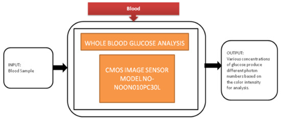 Diabetes is the most common disease, which is increasing rapidly across the world. Regular monitoring the glucose levels is the most suitable method to control diabetes in old-aged people by not making them prone to peripheral neuropathy. Jasmine Pramila Devadhasam et al. [18] developed a whole blood glucose analysis system using a smartphone camera using a point-of-care methodology. Its black-box approach is shown in Figure 11.