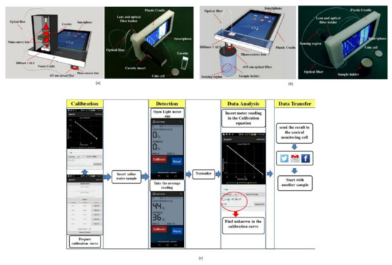 Salinity detection is also one of the crucial parameters to monitor for the protection of ocean management. If the sea salt level is above the normal value, it may cause oxygen and osmosis concentration changes. Iftak Hussain et al. [19] developed a smartphone-based salinity sensor to monitor the sea environment’s salt level. Two types of methods are proposed for sensing based on direct transmission, and evanescent field absorption approaches are shown in Figure 12a,b.