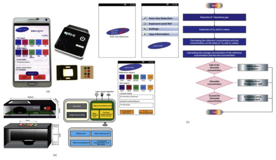 (a) Smartphone-based toxic gas detection system. (b) Instrumental setup for toxic gas detection microarray reader. (c) Stepwise illustration of smartphone application “Toxic Gas Detection.” Figure adapted with permission from [20].