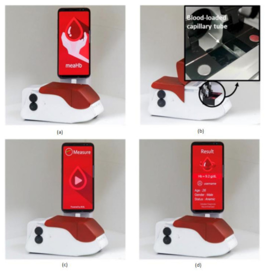 (a) Photo Thermal Angular Scattering technology (m-PTAS) sensor. (b) Blood sample capillary tube loaded into m-PTAS module. (c,d) Smartphone application “meaHb” displays the computed hemoglobin [21].