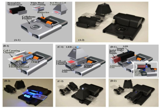 Hongying Zhu et al. [22] developed a portable and low-cost cytometry imaging platform incorporated with the cell phone to measure hemoglobin density and white and red blood cells from human blood samples. These measurements help in clinical tests to analyze the health conditions and diagnose the different blood disorders like anemia and leukemia. A dedicated android application called “Blood Analysis” is designed to perform the operations. Two AA batteries are included in a base attachment and a universal port to hold three components for white blood cell counting, red blood cell counting, and hemoglobin measurements. Three separate test procedures are conducted individually to identify the density of hemoglobin and white and red blood cells, as shown in Figure 15. Its software approach is shown in Figure 16.