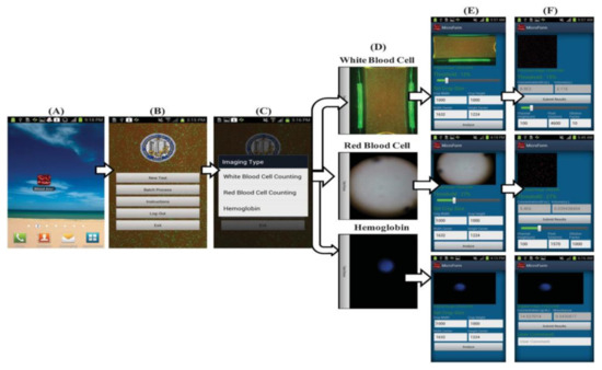 (A–F) Steps involved in the Android application to perform blood analysis and display results on a smartphone. Figure adapted with permission from [22].