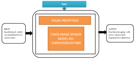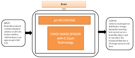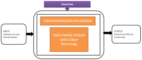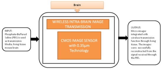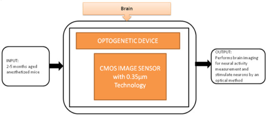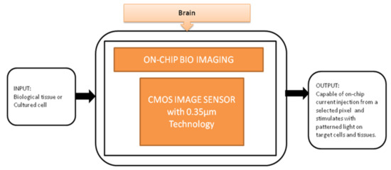 During the study of brain imaging, experiments will be conducted on small animals like rats under anesthesia because the brain’s activities will be hard to monitor under nonanesthetized conditions. Makito Haruta et al. [15] developed an ultra-small CMOS imaging device to monitor brain activities under non-anesthetized conditions. In addition, the author demonstrated the blood flow velocity detection in the brain using the CIS over a long period of non-anesthetized conditions. This imaging device is implanted in a rat head for demonstration shown in the paper cited. Its black-box approach is shown in Figure 8.