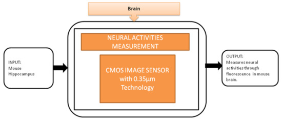 To observe the neural activities in the brain, fluorescence measurement is preferred over the electrical detection method because the fluorescence detection method is able to measure a large amount of data over a large area. Jun Ohta et al. [24] developed an implantable CMOS imaging device to record the neural activities in a mouse’s brain with minimal invasiveness. Its black-box approach is shown in Figure 18.