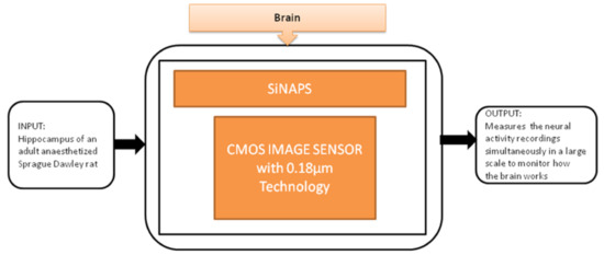 Gian Nicola Angotzi et al. [27] developed an implantable CIS probe for simultaneous large-scale neural recordings named “SiNAPS.” It was proposed to meet the requirements in neuroscience to analyze complex brain functions. Incorporating this device into procedures will allow capturing huge distributed cellular processing that characterizes and executes the brain’s complex functions, which will be useful in neural activity observations. Its black-box approach is shown in Figure 21.