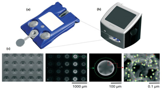 (a) Fingered powered agglutination lab chip. (b) Homemade CIS-based mini sensing system and finger powered agglutination lab chip (c) Antibodies were preloaded and pressing procedures, the agglutination lab chip is placed on CMOS image sensor of the homemade mini system. Figure adapted with permission from [14].