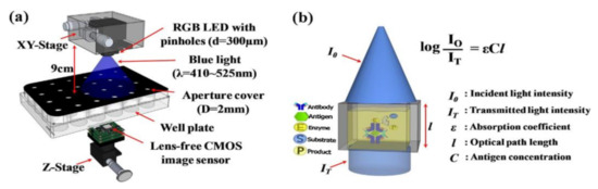 - Lee, J.; Kwak, Y.H.; Paek, S.-H.; Han, S.; Seo, S. CMOS image sensor-based ELISA detector using lens-free shadow imaging platform. Sens. Actuators B Chem. 2014, 196, 511–517. [Google Scholar] [CrossRef]