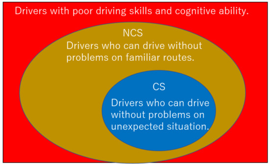 The older drivers are prone to dynamic hazard accidents such as collisions with other vehicles [15]. The driver’s physical function is impaired by mental stress [16]. We define coping skills as skills to properly step on the brake and stop the car when faced with an unexpected dynamic hazard under a mental workload such as impatience or nervousness. A driver with coping skills is defined as “CS”. A driver without coping skills is defined as “NCS”. The Venn diagram of CS and NCS is shown in Figure 1.