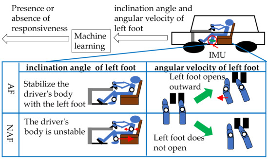 The driver feels stressed when a driver faces an unexpected situation. Mental stress induces muscular tension [16]. Muscle tension reduces the range of motion of joints. When the driver steps on the brake with his right foot, the driver moves his right foot forward to the left because the brake is next to the accelerator. Therefore, when the driver feels stressed and the range of motion of the joints is reduced, the driver may not be able to brake properly.