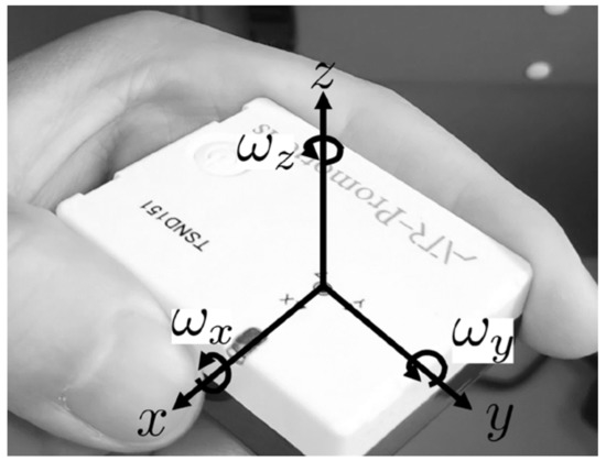 We used ATR-Promotion’s compact wireless multifunction sensor “TSND151” to acquire the movement of the driver’s left foot. Figure 3 shows the coordinate system of TSND151. The coordinate system of TSND151 is the right-handed coordinate system.