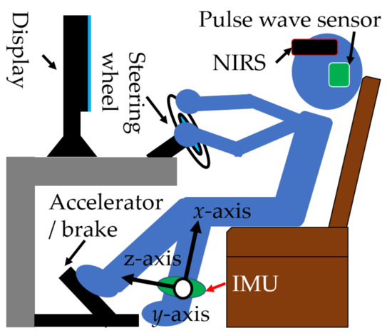 The measurement environment is shown in Figure 4 Table 2 shows the specifications of the measuring equipment. In this experiment, the movements of the left foot of the subjects and the amount of braking, accelerator, and steering operations were measured to acquire behavioral characteristics for dealing with unexpected situations. Since the amount of brake, accelerator, and steering is acquired, it is not necessary to measure the movements of both hands and right foot related to these operations. The amount of autonomic nerve activity is measured to objectively acquire the degree of nervousness. When the sympathetic nerve is predominant, it indicates that the subject gets nervous. Frontal lobe brain activity was measured to capture subject cognitive activity. The movement of the subject while driving or preparing to start the car was acquired by the IMUs. IMUs were attached to the left foot of the subject. The IMU measures the acceleration, angular velocity, and tilt angle of each axis. The amount of brain activity in the frontal lobe of the subject is acquired by near-infrared spectroscopy (NIRS). NIRS was worn on the subject’s head. NIRS measures frontal cerebral blood flow on 22 channels. The frontal lobe is the part of the brain that controls cognitive skills. The driver’s frontal cerebral blood flow represents the cognitive load on the driver. Therefore, NIRS can directly measure cognitive load. A related study uses the Detection Response Task (DRT) [25]. DRT indirectly measures cognitive load by asking the driver to respond when they detect a small light in their peripheral vision. DRT is an international standard, which can be safely applied with no appreciable effect on driving performance. However, in this study, we did not use DRT because we used NIRS to measure cognitive load directly. The amount of autonomic nerve activity is acquired by a pulse wavemeter. The pulse wave sensor measures very low frequency (VLF), low frequency (LF), high frequency (HF), total power (TP), heart rate (HR), and R–R interval (RR). As the characteristic elements of this experiment, the average, variance, maximum value, and minimum value of the measured values were calculated.