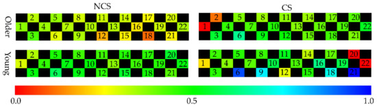 From Table 7 and Table 8, the difference between the CS group and NCS group in terms of C(6)avg and C(18)avg of the older driver who feels impatience or calm were statistically significant. Older drivers in the CS group have higher frontal cerebral blood flow than older drivers in the NCS group. The frontal lobe is the part of the brain that controls cognitive skills. The driver’s frontal cerebral blood flow represents the cognitive load on the driver. Older drivers in the CS group used more cognitive skills than older drivers in the NCS group. Therefore, it was suggested that the older drivers in the CS group were more aware of changes in the surrounding environment than the older drivers in the NCS group; as result, the older drivers in the CS group were activating the frontal lobe. The older drivers between the ages of 65 and 80 are prone to dynamic hazard accidents such as collisions with other vehicles [15]. It was suggested that older drivers in the CS group were aware of changes in their surroundings and were ready to deal with unforeseen circumstances, which led to a reduction in dynamic hazard accidents.