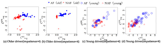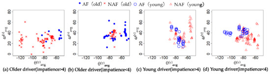 From Table 11 and Table 12, and Figure 9c,d, when the young driver felt calm, the tilt angle of the left foot of the young driver in the NCS group was more perpendicular to the ground than that in the CS group. However, there was no correlation between the young driver’s driving behavior and the young driver’s behavior when preparing to start the car. Besides, it was suggested that the young driver of the NCS group who felt impatient drove a car at a speed exceeding the speed limit, which was the cause of the accident of the young driver. Therefore, the coping skills of the young driver cannot be predicted from θ(y)avg in driving or preparing to start the car.