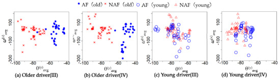 The behavioral characteristics of young drivers were different from those of older drivers; the tilt angle of the left foot of the young driver in the CS group was more perpendicular to the ground than that in the NCS group. Therefore, young drivers were not prepared for their left foot to deal with an unexpected situation. The difference between the CS group and NCS group in terms of the ω(x)avg of a young driver who feels impatience was not statistically significant. Young drivers have more muscle strength than older drivers [17] and can easily stabilize their bodies while driving a car. The young drivers are more responsive than older drivers [7]. Therefore, young drivers can respond immediately, even if they are not prepared to deal with unexpected situations. The cause of a young driver’s accident is different from that of an older driver. The related works point out that young drivers and older drivers have different causes of road accidents [15]. Young drivers between the ages of 15 and 24 generally have a relatively high accident rate of static hazards, such as collisions with fixed objects. Young drivers have lower driving skills and are more vulnerable to risk-taking than adult drivers [31,32]. From Table 9, the difference between the CS group and NCS group in terms of the average of the accelerator of a young driver who feels impatient was statistically significant. The average accelerator of young drivers in the NCS group who are feeling impatient is the highest. Therefore, it was suggested that the young driver of the NCS group who felt impatient drove a car at a speed exceeding the speed limit, which was the cause of the accident of the young driver.