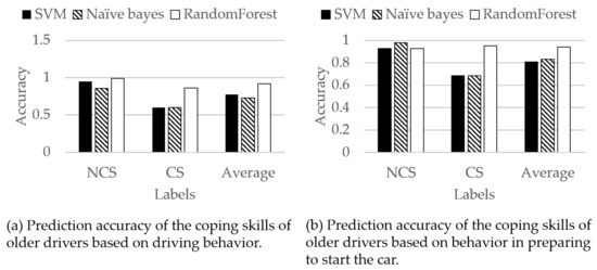 We evaluated the prediction accuracy of the CP system. The CP system predicts the coping skills of the older driver from the driving behavior when the older driver feels impatient. The objective variable is coping skills. The labels of coping skills are NCS or CS. The explanatory variables are θ(y)avg and ω(x)avg of the older driver while driving the car. Radial basis function (RBF)-SVM, naive Bayes, and random forest are used for binary classification. These machine learnings were implemented in the R language. Random forest was built using the random forest package. RBF-SVM and naive Bayes were built using the e1071 package. The parameters of each machine learning are default values in each package. For example, the decision tree of random forest is constructed with the classification and regression tree (CART) [24]. We constructed 500 decision trees. The decision tree is constructed with √D variables. D is the number of dimensions. Decision trees are not pruned. The CP system predicts the coping skills of the older driver from the behavior in preparing to start the car. The objective variable is coping skills. The labels of coping skills are NCS or CS. The explanatory variables are θ(y)avg and ω(x)avg of the older driver while preparing to start the car. RBF-SVM, naive Bayes, and random forest are used for binary classification. The parameters were the same as the parameters in predicting the coping skills of older drivers based on driving behavior. There are two missing values in the NCS group data of Experiments III and IV due to sensor malfunction. Leave one subject out cross-validation (LOSO-CV) was used for evaluation. Figure 10 shows the predicted results of coping skills using SVM, naive Bayes, and random forest. From Figure 10, the average prediction accuracy of random forest was the highest. Therefore, we focused on the prediction accuracy of random forest. Table 14 shows the results of predicting coping skills of the older driver based on driving behavior using random forest.