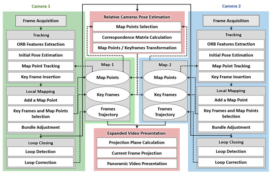 Since the conventional vSLAM is limited to the localization and mapping of a single monocular or stereo camera, we propose a vSLAM method for multi-camera setup where there is no constant baseline between cameras. Figure 2 shows the pipeline of the proposed approach. It extends the monocular Oriented features from an accelerated segment test and Rotated Binary robust independent elementary features—Simultaneous Localization And Mapping (ORB-SLAM) [14], which contains three parallel threads for tracking, mapping, and loop closing. In the proposed algorithm, the above three processes are performed for each camera, and a new thread is used to calculate the transformation from one camera to another. Another thread is also added to the proposed approach to produce the final expanded view, resulting in eight parallel threads. The details of the proposed approach will be presented in the following sub-sections.