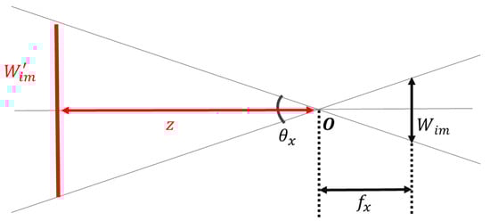 In vSLAM, the camera’s self-position is defined as the camera’s principal point. Therefore, it is necessary to define the plane on which the camera image is projected and its size using camera parameters. Figure 3 shows the pinhole camera model observed from the y-axis direction. O is the principal point, is the angle of view in the x-axis direction, is the focal length along the x-axis, is the width of the image, and is the width of the image on the projection plane. Here, if the distance Z from the principal point to the projection plane is used as a parameter, the width of the projected image can be defined as in (3).
