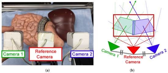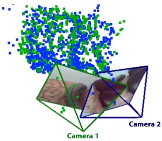 Takada et al. [12] proposed a method for real-time surgical view expansion using multiple CARET devices. In this method, intra-camera tracking is used to estimate the relations between consequent camera frames. The correspondence between the different cameras is calculated at the initialization stage and is updated frequently when there is enough overlap between the views. This method can maintain the extended view even when there is no overlap between cameras. However, the error accumulation over a long time leads to inaccurate mosaicking results. In [13], an enhanced method was proposed by the same team to enhance the tracking accuracy and to construct a more accurate expanded view. In the method, image enhancement and feature point filtering are utilized to reduce the error. The evaluation results showed that this method performed better than the original one in most cases and can produce an expanded view at a rate of fps. However, both methods assume that the environment is planar and they depend on 2D feature points tracking and homography transformation, which leads to inaccurate results. Additionally, the method can fail due to the difficulty of finding matches between the feature points at the initialization phase.