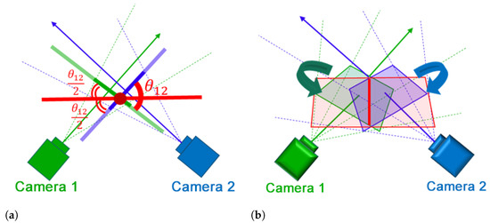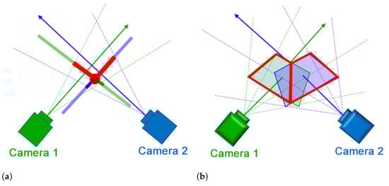 Instead of using two different planes, one for each camera, we propose a method to create a single projection plane according to the intersection of camera planes. In Figure 5, camera 1 and camera 2 are represented using green and blue colors, respectively. The optical axis of each camera is represented using a solid straight arrow originating from the camera’s principle point. The four dotted lines connect the camera principle point to the vertices of the corresponding camera image. In Figure 5a, the solid lines perpendicular to camera’s optical axis represent its projection plane. The distance between the projection plane and the principal point is determined by the parameter Z used in Equations (3) and (4).