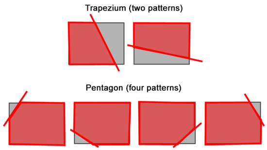 We propose a method to combine different views by removing the overlap area that appears in both views. To determine the overlap area, the intersection line is calculated using (5) and the overlap area is removed accordingly. The green and blue cameras shown in Figure 6 indicate camera 1 and camera 2, respectively. The solid arrow is the optical axis, the dotted lines are the straight lines connecting the principle camera point and the vertices of the camera image and the thick solid line represents the camera image plane. The intersection line between the camera image planes is represented by a red circle in Figure 6a and a red line in Figure 6b, and the camera image after cropping is represented by a red line. As shown in Figure 7, the shape of the camera image polygon after removing the area of overlap is one of six shapes: two trapezoids and four pentagons. We cut and transform texture objects according to their shape. By associating the deformed texture object with the polygon vertices of the camera image in the GL space, an image with the overlap region cut out is rendered.