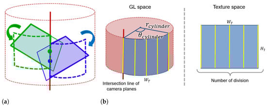 Influenced by the fact that the abdominal area can be considered as a cylinder, we propose a method to project the extended view on a cylindrical surface. We define a cylinder that touches the projection plane used for the planar projection method. In Figure 8a, the red solid line is the intersection line between the two camera image planes defined by Equation (5), and the red dotted line is the cylinder that touches the plane. At the intersection line between camera image planes, the midpoint of the line segment from the upper side to the lower side of the camera image is calculated. The camera image is then projected onto the cylindrical surface based on the midpoint shown in Figure 8a. In GL space, OpenGL texture mapping needs a two-dimensional image. Accordingly, instead of using an exact cylinder, we define a polygonal cylinder with a rectangular side as an approximate cylinder. As shown in Figure 8b, each camera image is divided into rectangular strips that are projected one by one onto the approximate cylinder in the GL space. Increasing the number of strips results in a smooth cylindrical surface whereas it increases the computation time. To project an image of width that matches the arc length on the approximate cylinder, the approximate cylinder radius is defined as in (8) with the angle that determines the projection range.