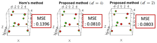 From this result, it is confirmed that the proposed enhanced estimation method has a smaller estimation error and a higher accuracy than Horn’s method. In Figure 9, the red points are the point cloud that represents camera 1, and the green points are the point cloud that represents camera 2 after transformation using the estimated correspondence matrix. The mean square error (MSE) between point clouds was calculated for each method. The results indicate that the MSE of the proposed improved pose estimation method is significantly lower than the MSE of Horn’s method.