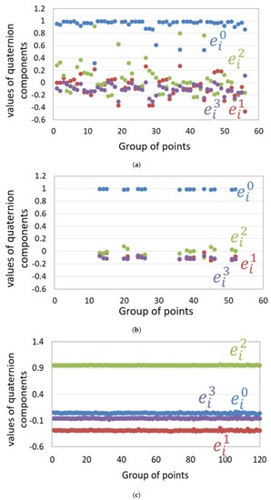 Quaternions calculated using different groups of corresponding vSLAM map points (a) without outlier removal, (b) after outlier removal and (c) ideal set of points.