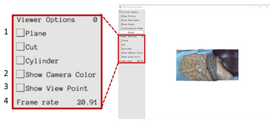 We also evaluated the proposed presentation methods based on a specialist’s opinions. The user interface shown in Figure 13 was created in order to continuously construct the expanded view using the proposed video presentation methods. In Figure 13, “1” can be used to switch the video presentation method. By using “2”, the operator can display the border of the camera images in two different colors (camera 1: green and camera 2: blue). The number “3” indicates the viewpoint position and “4” indicates the frame rate. A Gastroenterologist observed the expanded views construed using the proposed presentation methods and commented on them. According to the specialist’s opinion, it was found that the stability of the resulting video is very important. From the stability point of view, both planar and cylindrical projection methods have many flickers, suggesting that the images are less visible to the operator. The overlap removal method has less flicker than the other two methods, and a stable video output is possible, which makes it more suitable in real situations.
