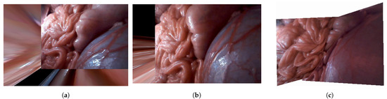 In the literature, there are many attempts to extend the surgical field of view using image mosaicking and mapping techniques. In [2], image mosaicking was used to construct a panoramic image of the bladder from a set of images obtained from an endoscope. The authors used mutual information to initially align all images and afterwards all transformation was adjusted to enhance the visibility of the final panoramic image. This method is useful for providing a static view; however, it cannot provide a real expanded view in real time. Additionally, images’ overlap is essential for image registration. A similar method for enhancing the surgical view in Natural Orifice Transluminal Endoscopic Surgery (NOTES) was also proposed in [3]. Vemuri et al. [4] extended the conventional mosaicking approach to construct a panoramic image from a sequence of laparoscopic images. In their approach, feature extraction and matching between consequent images are utilized to estimate planar homography transformations. These transformations are recursively combined to map the current frame to the reference frame. Bundle adjustment is then used to reduce the accumulated error. In their method, a static panoramic image can be constructed, and it suffers from the same limitation of the previous methods. Image feature tracking was also utilized in [5] to estimate image-to-image transformation and to construct an extended view by stitching together several video frames. This method can work at an average rate of fps. Several similar stitching methods can be found in this review article [6].