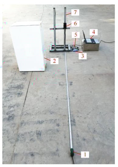 LiDAR sensor check experiment: 1. Tape measure; 2. Paper box 3. Current signal acquisition card; 4. Laptop computer; 5. Power source; 6. LiDAR sensor 7. Fixation frame.