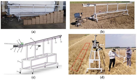 Detection performance experiment of the LiDAR sensor. (a) Setup for the step detection experiment. (b) Setup for the field ground detection experiment. (c) Structural diagram of the experimental platform for Hb detection, 1. Mecanum wheel; 2. Support frame; 3. Limit switch 1; 4. Limit switch 2; 5. Laser rangefinder; 6. Stepper motor; 7. Sliding block; 8. Laser-reflecting plate; 9. Sensor fixation bar; 10. LiDAR sensor; 11. Synchronous belt; 12. Sliding track; 13. Limit switch 3; 14. Limit switch 4. (d) Setup for the height detection experiment in a WS field.
