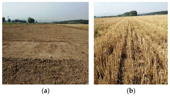 Experimental fields. (a) Rotary-tilled field. (b) WS field.