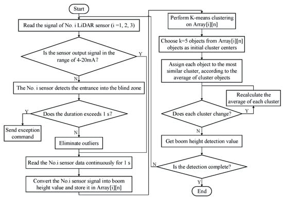 Our previous study contains more details on this process []. The flow chart of the Hb calculation based on the K-means clustering algorithm is shown in Figure 6. During the working process, the Hb detection system reads the three LiDAR sensor signals in real-time, and it first judges the validity of the sensor detection signal. If the detection signal is abnormal, it will judge whether the sensor has entered the blind zone. Once the LiDAR sensor has entered the blind zone, the system will send a data exception command. Otherwise, the system will convert the obtained data into Hb values every 1 s and store them in an array form and then call the K-means clustering algorithm to preprocess the acquired Hb detection data, ultimately obtaining accurate Hb detection values.