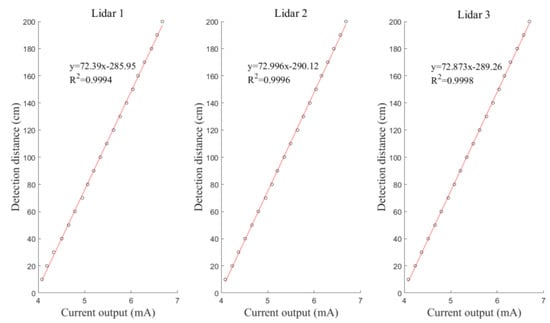 The Hb values measured by the LiDAR sensor for the left, middle, and right sections of the boom were fitted to the output current data. Figure 7 shows the fitted curves for the left, middle, and right sections of the boom. The R2 values of the equations are 0.9994, 0.9996, and 0.9998, respectively. Evidently, the three LiDAR sensors show good linearity and meet the operating requirements.