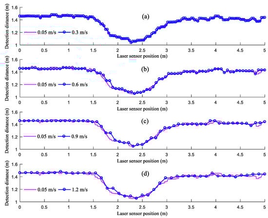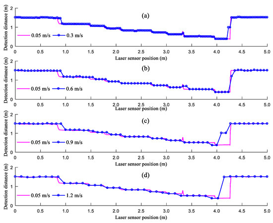 Figure 8 shows the distances detected by the LiDAR sensor when moving at different speeds. As demonstrated in Figure 8, the distances detected by the LiDAR sensor when moving at different speeds can reflect the changes in the step height. However, the distances detected by the LiDAR sensor at the junctions of the ground and the upper surface of the flight of steps formed by paper boxes differ from the true values. In addition, this difference becomes increasingly prominent as VLiDAR increases. This is because the angle of spread of the beam transmitted by the LiDAR sensor is 3.6°. As the LiDAR sensor moves to directly above each junction of the ground and the upper surface of the flight of steps, the beam transmitted by the LiDAR sensor partially reaches the ground and partially reaches the upper surface of the flight of steps, thus affecting the distance detected by the LiDAR sensor. As the detection of the LiDAR sensor moves from the ground to the upper surface of the flight of steps, there is a detection delay in the LiDAR sensor. Moreover, as VLiDAR increases from 0.3 to 0.9 m/s, the detection delay increases. As VLiDAR increases from 0.9 to 1.2 m/s, the detection delay decreases. This is because as VLiDAR increases, there is a decrease in the amount of data sampled over the same distance of movement, and the low amount of sampled data increases the detection delay. The junction between the ground and the upper surface of the flight of steps is relatively small. When moving at a speed of 1.2 m/s, the LiDAR sensor is unable to detect the junction; therefore, the detection delay is reduced. As the LiDAR sensor moves from the upper surface of the flight of steps to the ground, the distances detected by the LiDAR sensor are between those from the ground and the upper surface of the flight of steps. This is because the large difference between the heights of the ground and the upper surface of the flight of steps at this junction increases the probability for the beam transmitted by the LiDAR sensor to reach the sides of the flight of steps. A low VLiDAR leads to a high probability that the beam transmitted by the LiDAR sensor reaches the sides of the flight of steps.