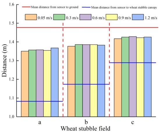 The autumn crops are generally planted without tillage after harvesting wheat in China. It is necessary to spray pesticides and remove weeds before no-tillage planting. To examine the effects of WS canopies on the Hb detection performance of the LiDAR sensor, an Hb detection experiment in a post-harvest WS field was designed, as shown in Figure 3d. Before the experiment, an unharvested wheat plot 5.0 m long and 0.3 m wide was randomly selected. A harvester was then used to harvest the wheat in the plot. The header height of the harvester was set to 0.35, 0.25, and 0.15 m for areas a, b, and c of the plot, respectively, as shown in Figure 3d. Post-harvest areas a, b, and c were 1.5, 2.2, and 1.3 m in length, respectively. During the experiment, the experimental platform for Hb detection was first placed in each WS area in such a way that the LiDAR sensor was directly above the selected WS canopy. After the experimental platform was placed, the LiDAR sensor was moved to the starting position. A tape measure was used to measure the distances of the LiDAR sensor from the WS canopy and the ground at intervals of 0.1 m until the LiDAR sensor moved to its final position. Subsequently, VLiDAR was adjusted to 0.05 m/s, and the measurements taken by the LiDAR sensor when moving at this speed were treated as the true values. Finally, the sliding block was controlled to move at speeds of 0.3, 0.6, 0.9, and 1.2 m/s. The measurements taken by the LiDAR sensor at these speeds were collected. Three repeats were performed for each test. The average of the three measurements taken by the LiDAR sensor was used as its ultimate measurement.