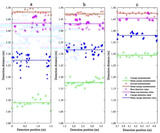 To investigate the effects of VLiDAR on the detection performance of the LiDAR sensor for the WS roots and canopy in each area, the detection errors of the LiDAR sensor moving at different speeds for the WS roots and canopy in each area were analysed. Table 3 summarizes the results. As demonstrated in Table 3, VLiDAR has a greater impact on the detection performance of the LiDAR sensor for the WS canopy than that for the WS roots in each area. For the WS roots in areas a, b, and c, the maximum detection errors of the LiDAR sensors are 4.66%, 3.67%, and 2.44%, respectively, and the minimum detection errors are 2.43%, 2.45%, and 0.68%, respectively. For the WS canopies in areas a, b, and c, the maximum detection errors of the LiDAR sensors are 20.02%, 12.84%, and 8.50%, respectively, and the minimum detection errors are 16.80%, 11.48%, and 6.65%, respectively. When HWS remains unchanged, VLiDAR has a slight impact on the detection errors of the LiDAR sensor for the WS roots and canopy. In addition, when VLiDAR remains unchanged, as the WS canopy height decreases, the detection errors of the LiDAR sensor for the WS roots and canopy decrease.