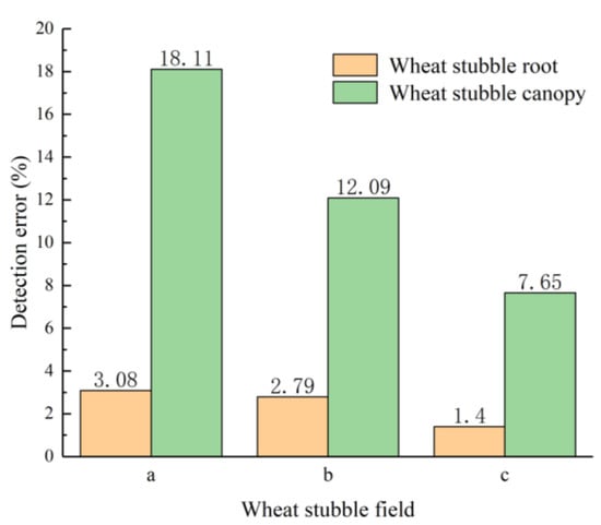 To analyse the effects of HWS on the detection performance of the LiDAR sensor for the WS roots and canopy, the mean errors of the distances detected by the LiDAR sensor from the WS roots and canopy in areas a, b, and c were statistically analysed, and the results are shown in Figure 12. As demonstrated in Figure 12, for each area, the mean error of the distances detected by the LiDAR sensor from the WS roots is lower than that of the distances detected by the LiDAR sensor from the WS canopy. As HWS decreases, the mean detection errors of the LiDAR sensor for both the WS roots and canopy in each area gradually decrease. The maximum and minimum detection errors of the LiDAR sensor for the WS roots are 3.08% and 1.40%, respectively. There are no significant changes in the detection error of the LiDAR sensor between areas a and b. However, the detection error of the LiDAR sensor for area c is notably lower than those for areas a and b. This is because in areas a and b, the WS canopy is relatively high, and the litter layer at the WS roots had been relatively insignificantly damaged during the harvesting process. In contrast, in area c, the litter layer had been relatively significantly damaged during the harvesting process, so the beam transmitted by the LiDAR sensor mostly reaches the WS roots. As a consequence, the detection error of the LiDAR sensor for the WS roots is demonstrably lower in area c than areas a and b. For the WS canopies, the maximum and minimum detection errors of the LiDAR sensor are 18.11% and 7.65%, respectively, and the detection error of the LiDAR sensor changes considerably in areas a, b, and c. This is because as HWS decreases, there is an increase in the density of the WS canopy. In addition, the presence of a relatively large amount of litter below a relatively low WS canopy improves the ability of the WS canopy to reflect the laser beam and, thereby, increases the detection accuracy of the LiDAR sensor for the WS canopy.